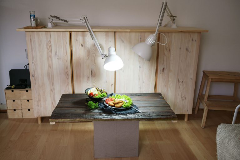 Flatlays von oben gesehen sind in dieser Höhe allerdings nicht mehr möglich, es sei denn, man steigt auf eine Leiter. In solchen Fällen setze ich das gesamte Arrangement einfach eine Etage tiefer. Die beweglichen Arbeitsleuchten lassen sich auch unterhalb ihres Standfußes sehr gut einstellen.